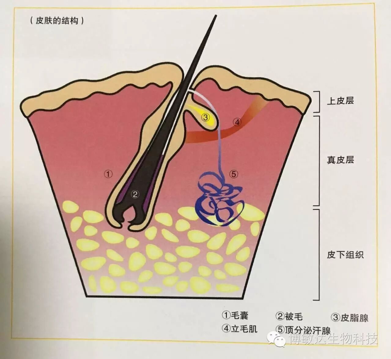 皮肤分三层:上皮层、真皮层和皮下组织3层,此外还有被毛器官(毛囊和毛)、立毛肌、皮脂腺、汗腺、趾甲等附属器官。